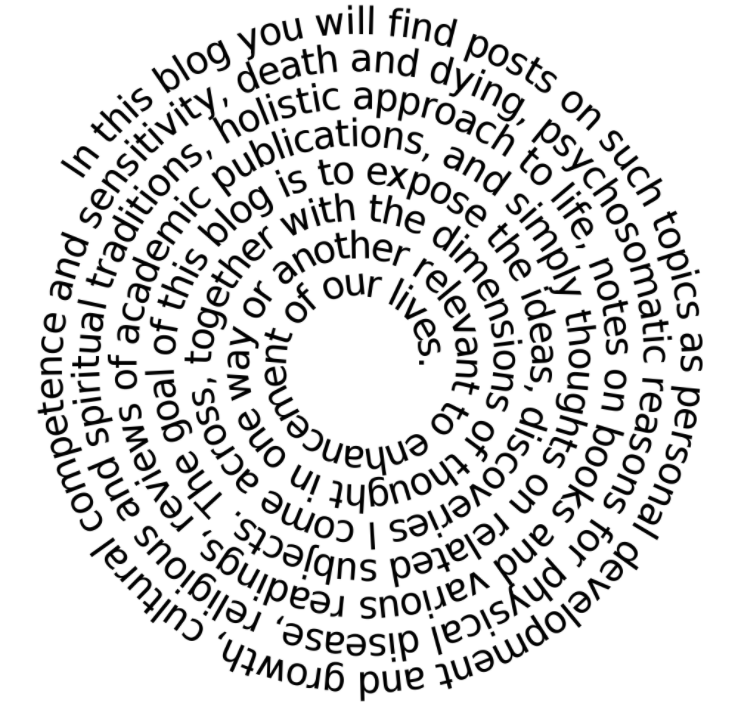 In this blog you will find posts on such topics as personal development and growth, cultural competence and sensitivity, death and dying, psychosomatic reasons for physical disease, religious and spiritual traditions, holistic approach to life, notes on books and various readings, reviews of academic publications, and simply thoughts on related subjects.